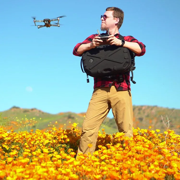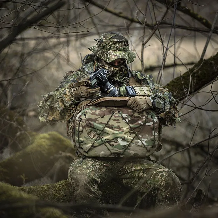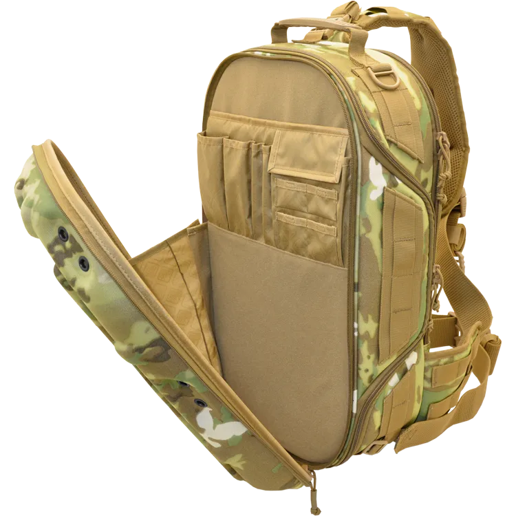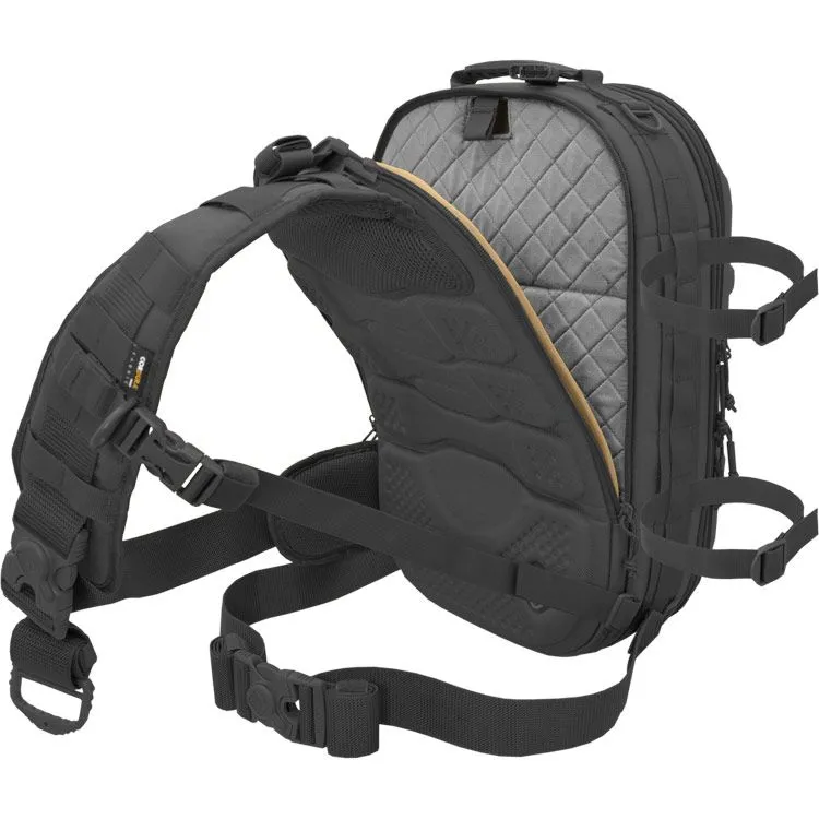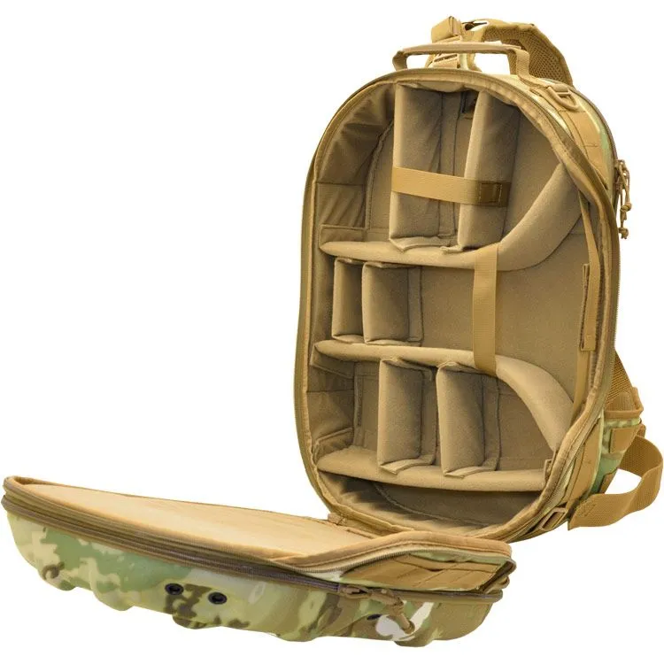 Molded-foam and 360° padded walls protect gear, and support load mounts. The sling configuration allows sliding from back to chest for fast access. Open it all the way up or just from the side-hatch designed for primary camera access while on the chest or sitting sideways. The first pack of its kind to also feature a waist belt to hold heavy loads while allowing sling use as well. Modular padding dividers accommodate cameras, DJI drones, various optics, and electronics, etc. for demanding users like press, travel vloggers, military/agencies, etc. The aesthetics project a progressive technology image for professional use and client work. Padded flat compartments are provided to fit a 16” pc/mac laptop, and a separate tablet. An organization panel hosts accessories like card-readers, sd cards, pens, etc. Personal items like snacks, rain shell, or first aid kits fit into the top shell section; These items are often not allotted for on most photo/digital type packs, but are important since the users are often on their own and outdoors for extended time. The top shell has 6 spots for our patented Hardpoint® parts allowing optional attachment of loops, lights, bungee systems, MOLLE panels, etc. This pack is also very suitable for motorcycle use as it won't flap in the wind. The molded back-pad is abrasion resistant while conforming to the spine and ventilating sweat. Military modular webbing (MOLLE) is provided throughout on the sides and strap, while the interior is lined with fuzzy tricot for expansion with pouches, hook-backing i.d. patches, etc. YKK® Zippers, real Cordura® 1000D nylon (Scorpion model is similar 600D Polyester) and reinforcing stitch patterns ensure lasting quality. Our patented locking roto-buckle is used on the main strap, as is our patented photo-d-ring which allows mounting of ¼-20” screw equipment like cameras as a leash. ¼-20” screw ports are also provided on the hard-MOLLE polymer strips to add lighting, grips, etc. See the details below for the full feature set.