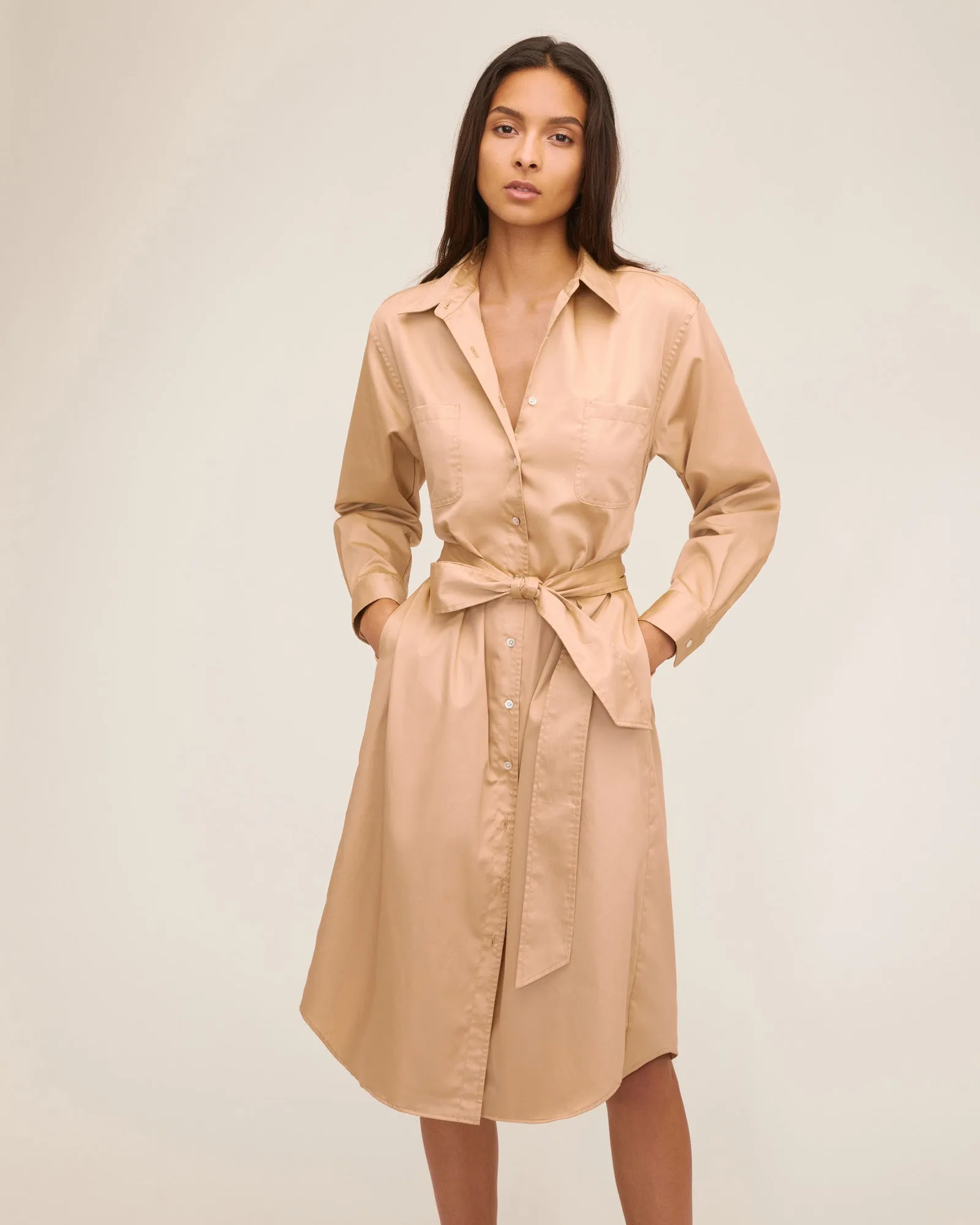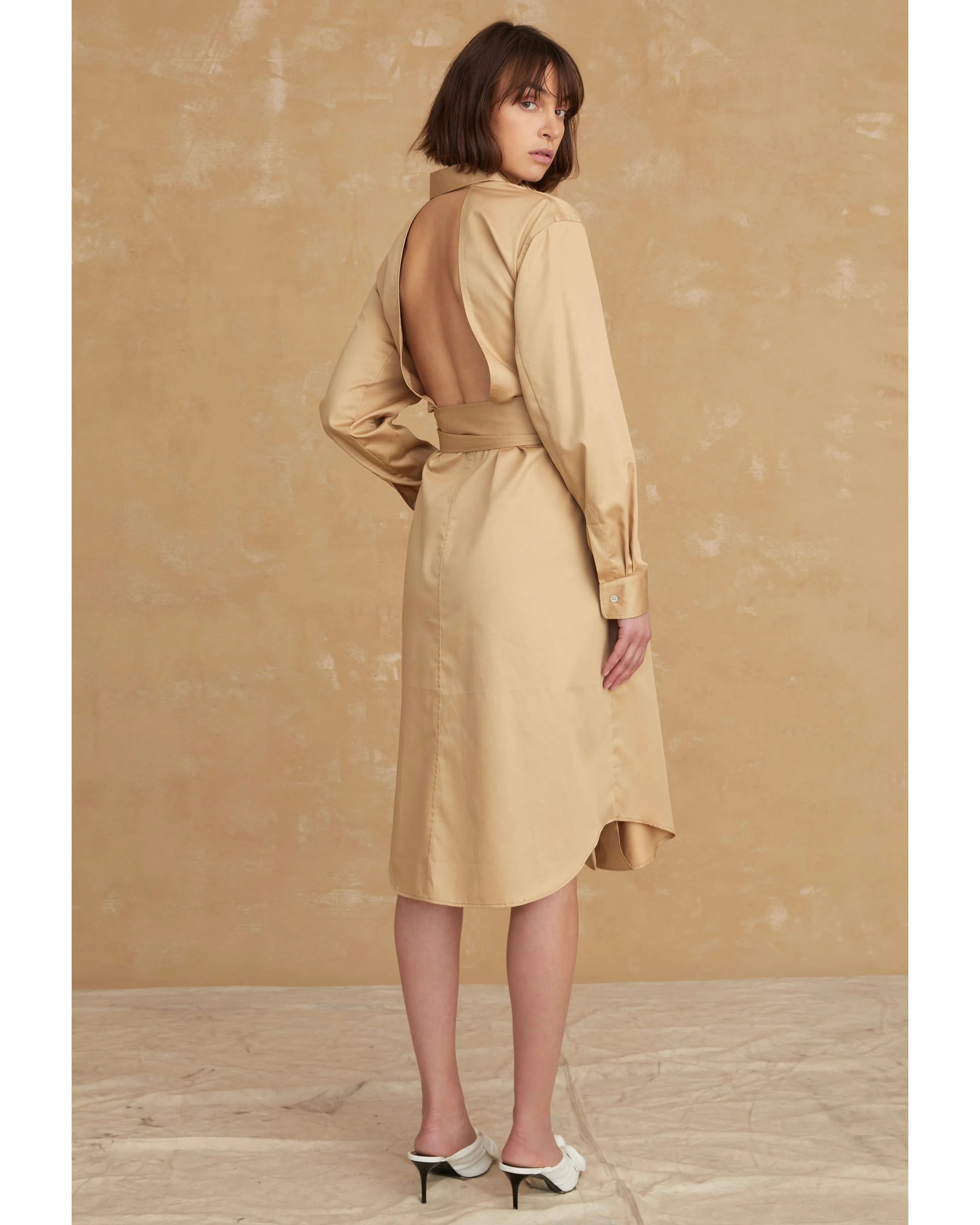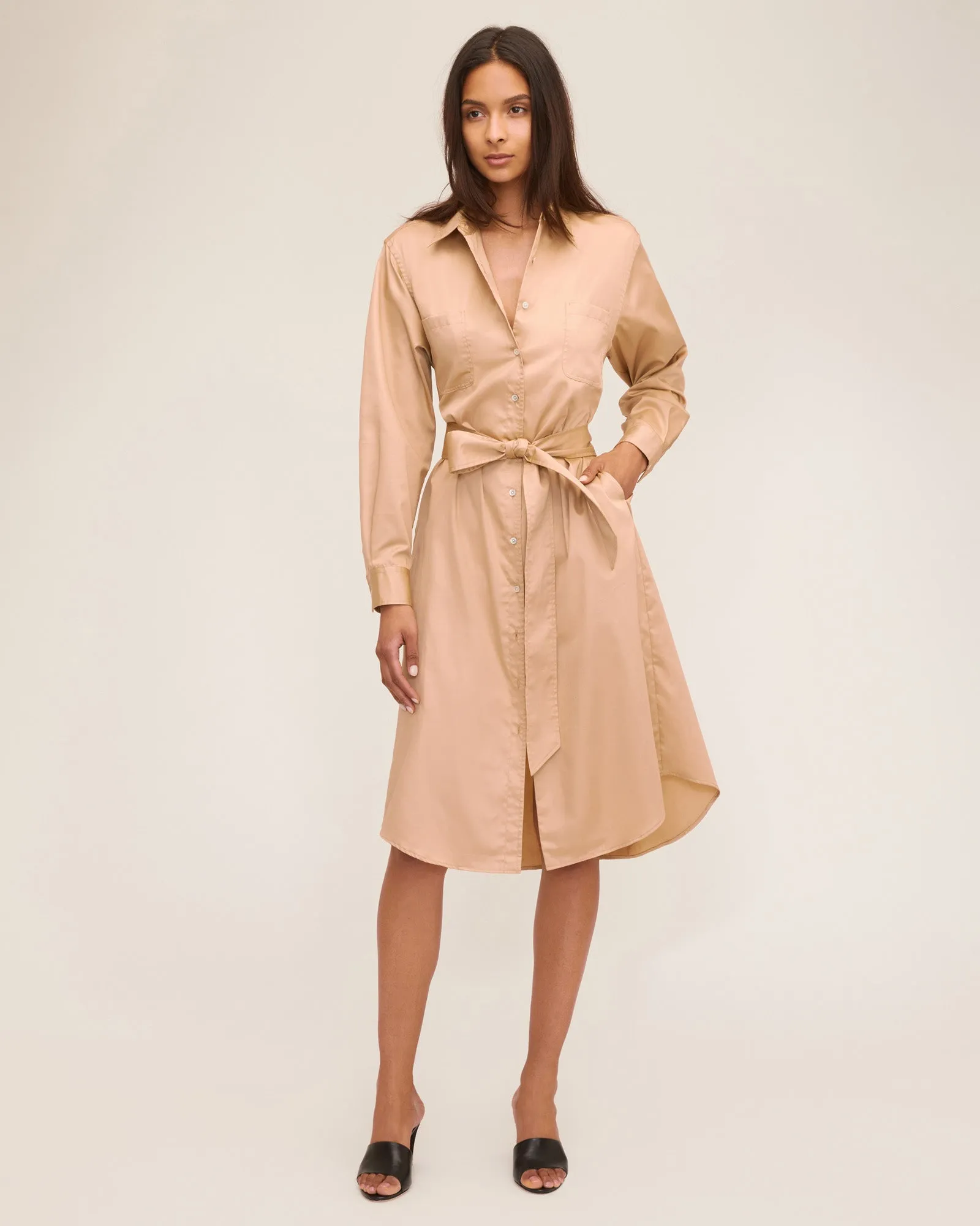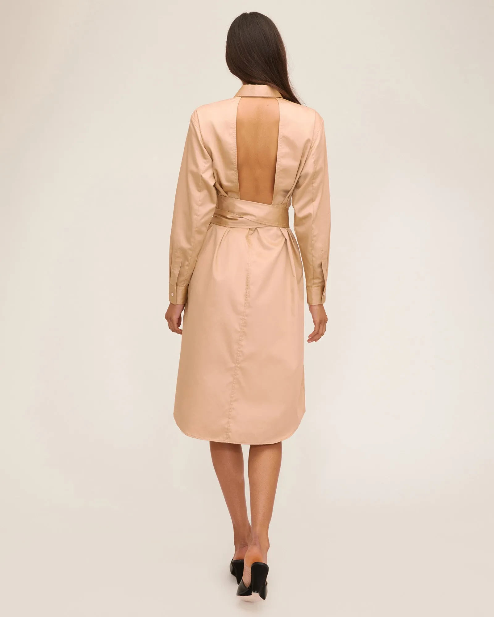 An elevated update to the iconic button-down shirt dress. The open U-back, with a shirttail hem and waist sash gives a modern twist to a classic silhouette. Our Brett cotton sateen U-Back Midi Dress offers a flirty vibe that can be worn everyday, anywhere.