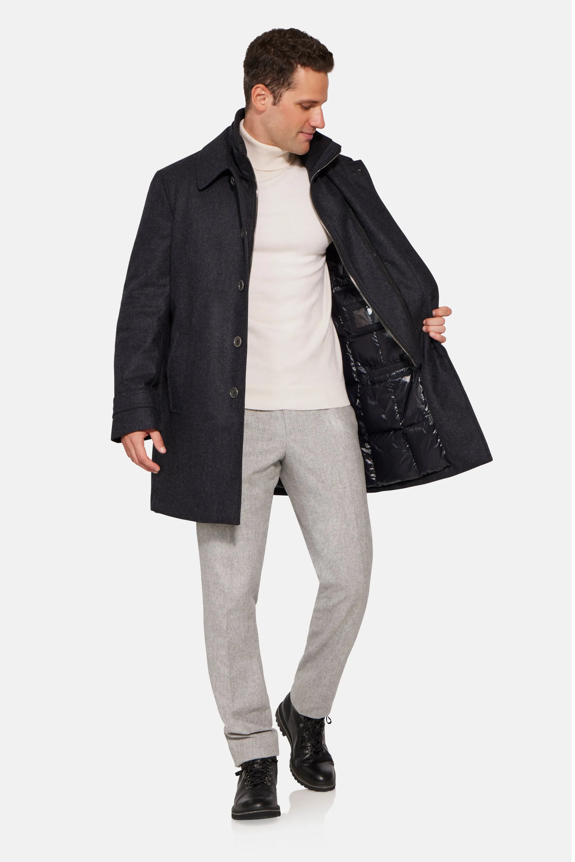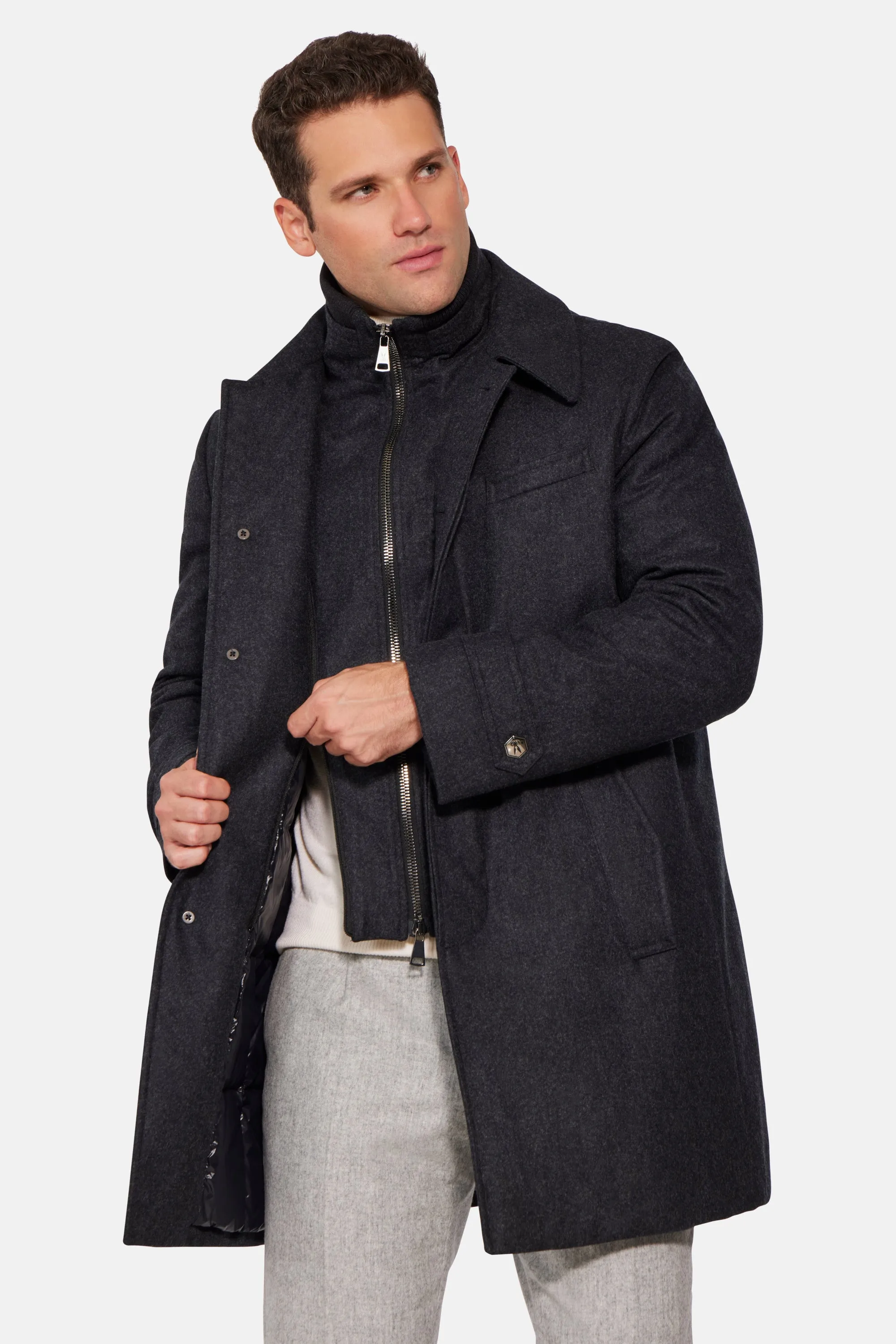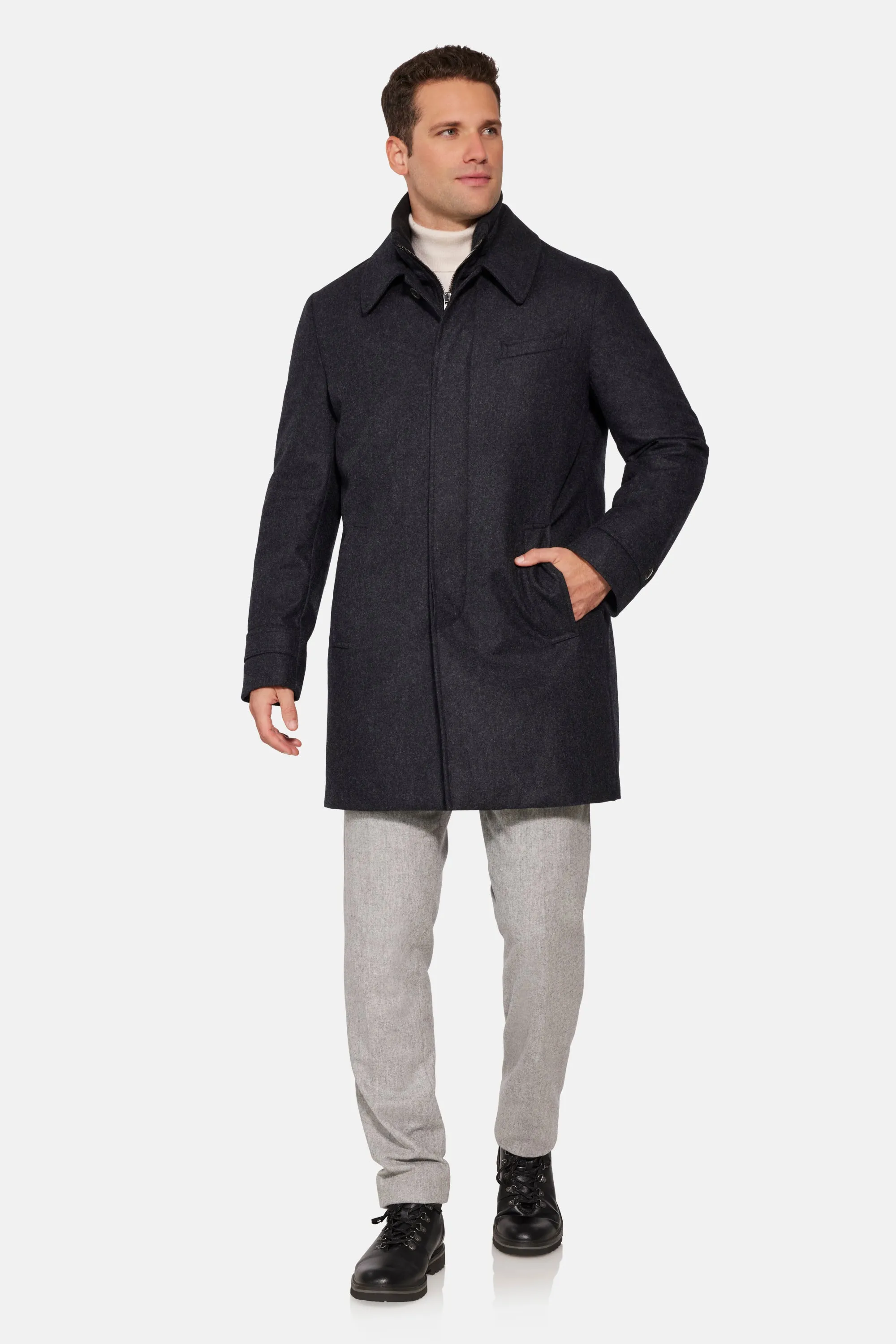 Mid length commuter overcoat with a removable winter chest bib. Designed to be very light-on-the-body but ultra warm and with high performance protection. Features a sharp, timeless, silhouette packed inside of a luxury, waterproof, insulated coat. Can be worn as a formal topcoat or worn casually.