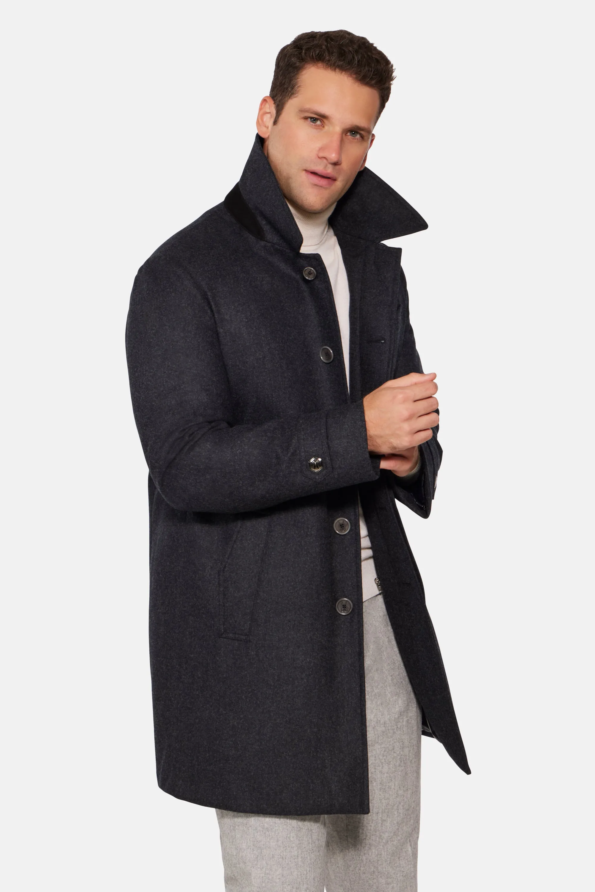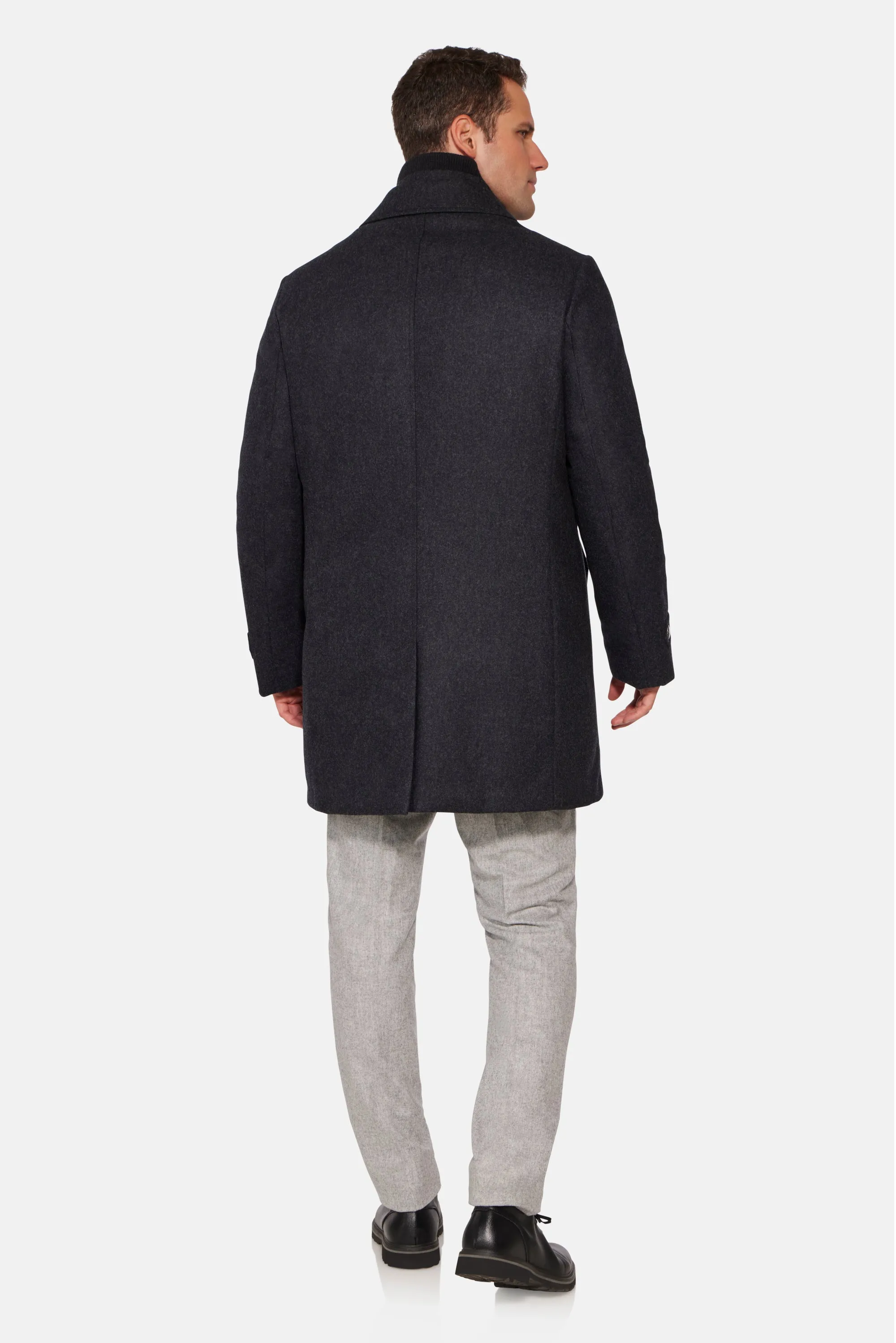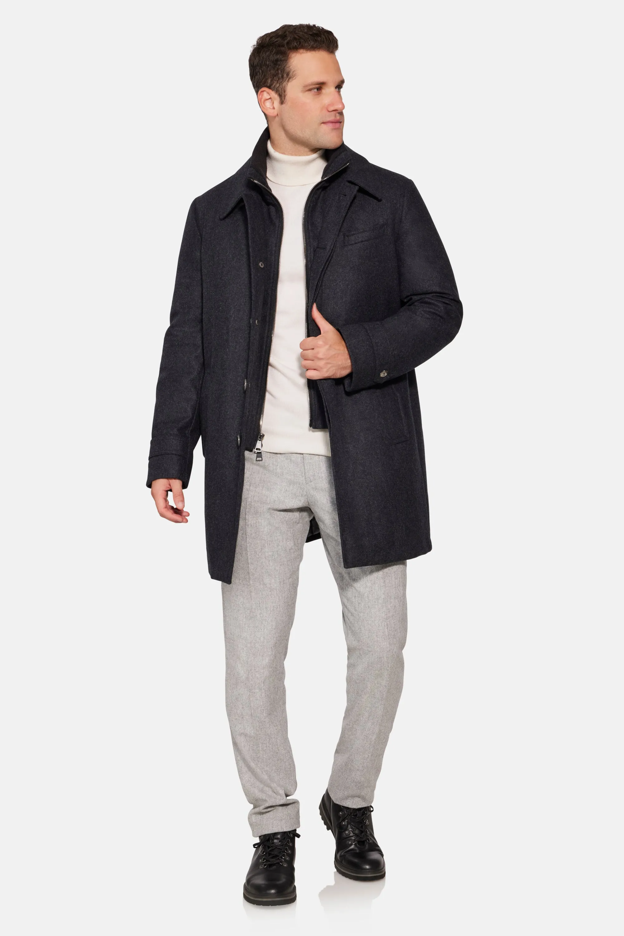 Mid length commuter overcoat with a removable winter chest bib. Designed to be very light-on-the-body but ultra warm and with high performance protection. Features a sharp, timeless, silhouette packed inside of a luxury, waterproof, insulated coat. Can be worn as a formal topcoat or worn casually.