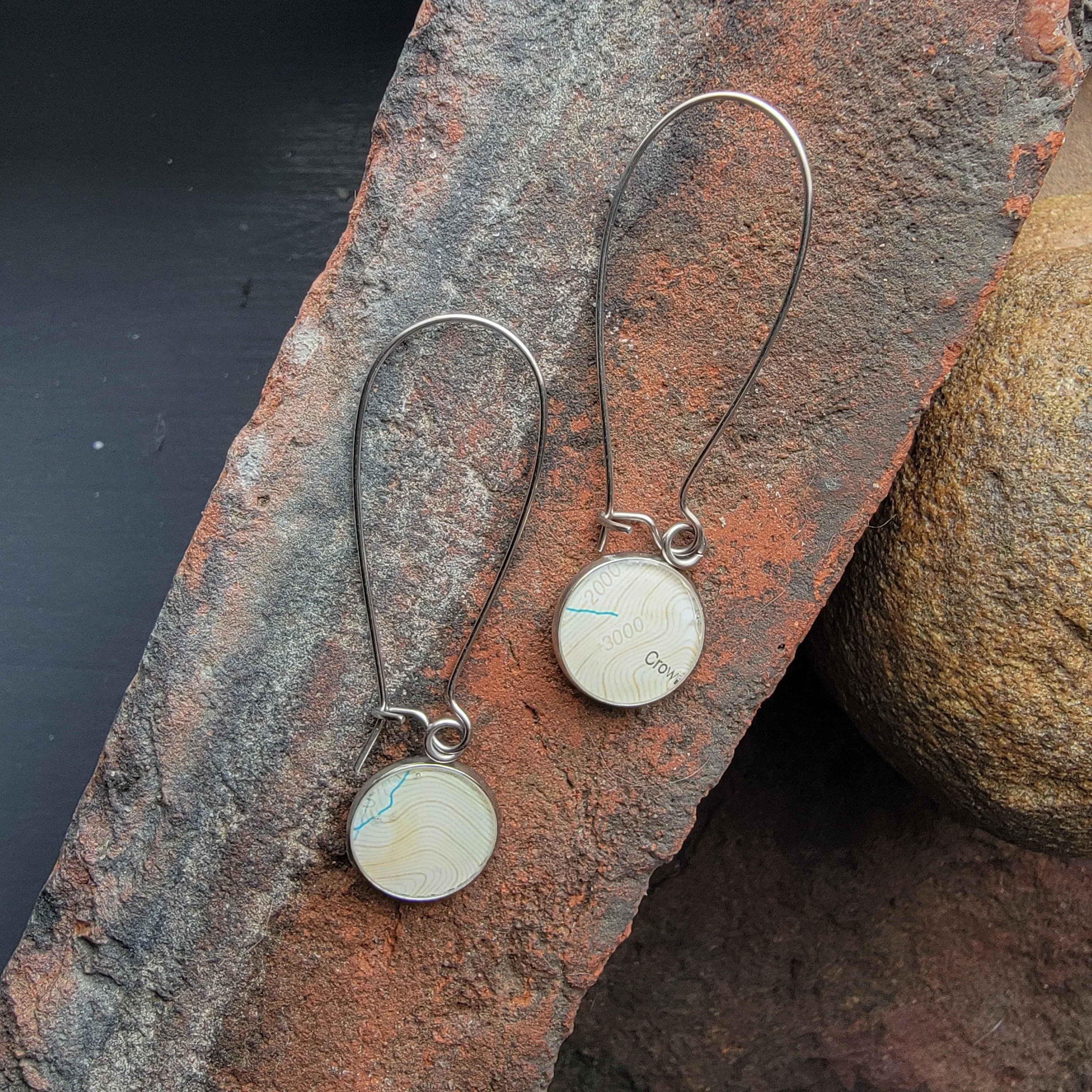 This is our handmade round kidney dangle salmon earrings, which comes in two sizes, 12mm, and 14mm, with a kidney dangle hook. It features topographical maps of your favorite part of the beautiful Alaskan wilderness.